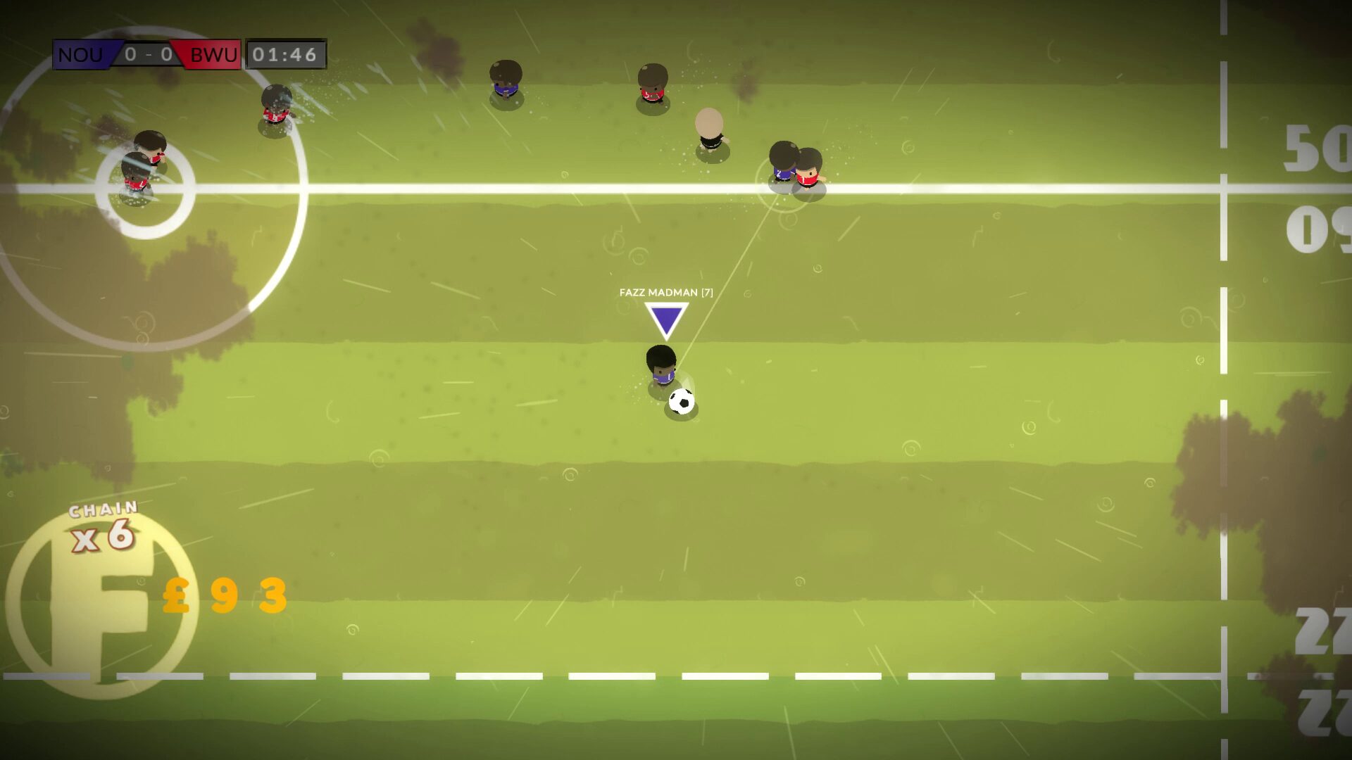 What holds it all together is the fact that, aside from the dodges, massive slides and big kick abilities, this football game feels delightfully self-aware that it is a parody of the sport. The writing in the campaign mode — which follows a new footballer through the league, like FIFA’s The Journey mode — is loaded with silliness and idiocy, clearly exposing Size Five Games’ emergence point as a developer with their Ben There, Dan That point-and-click series which launched back in the noughties. It’s not just the story mode which the humour presents itself in; a tickertape rolls under the league table, churning out nonsense news of churlish and childish kickmen. The sponsors are silly, as are player and team names.